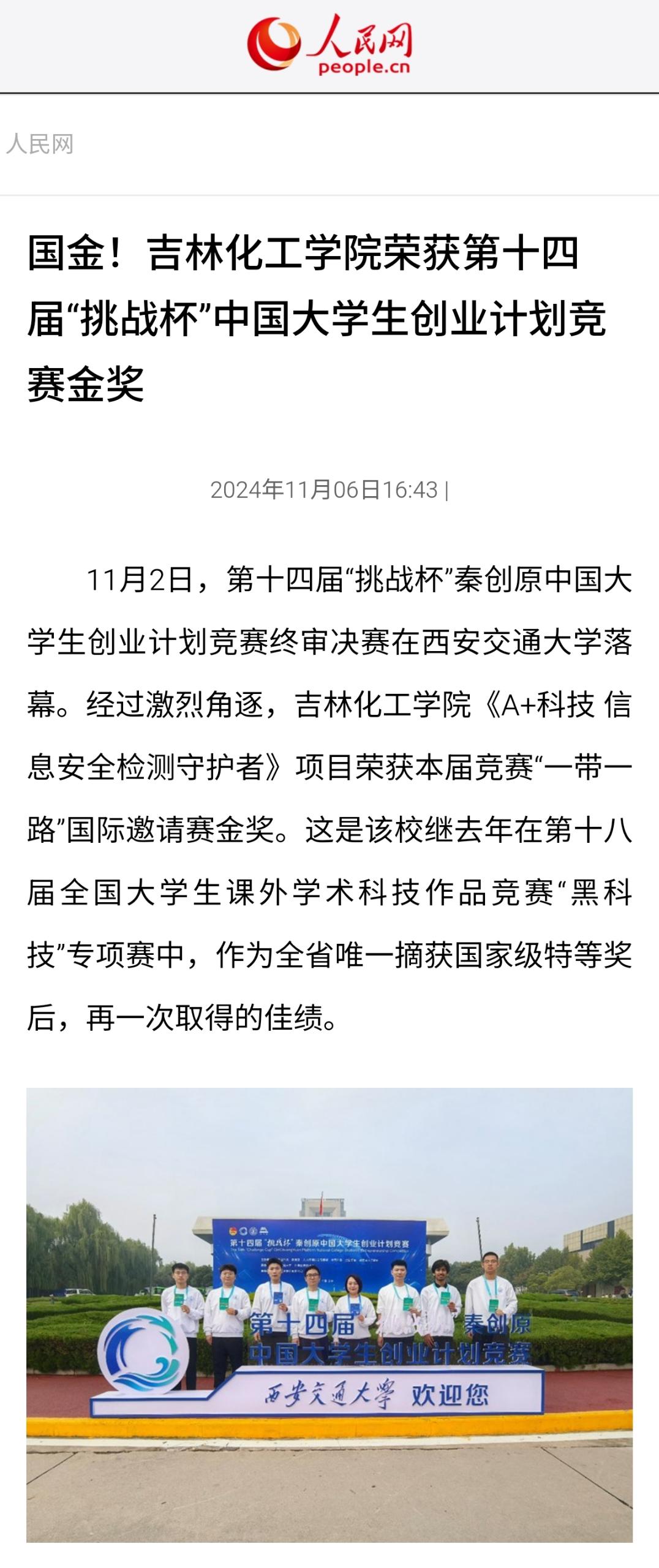 2024年11月6日《人民网》报道第十四届“挑战杯”秦创原中国大学生创业计划竞赛终审决赛在西安交通大学落幕。经过激烈角逐,吉林化工学院《A+科技 信息安全检测守护者》项目荣获本届竞赛“一带一路”国际邀请赛金奖。这是该校继去年在第十八届全国大学生课外学术科技作品竞赛“黑科技”专项赛中,作为全省唯一摘获国家级特等奖后,再一次取得的佳绩。